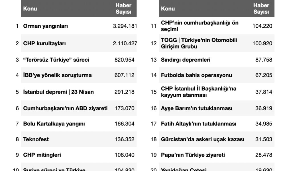 “2025te dijital basının gündeminde öne çıkan olaylar arasında ikinci onda ise şunlar yer aldı; CHPnin cumhurbaşkanlığı ön seçimi (104.220 haber), TOGG (100.920 haber), Sındırgı depremleri (87.758 haber), futbolda bahis operasyonu (67.205 haber), CHP İstanbul İl Başkanlığına kayyum atanması (37.814 haber), Ayşe Barımın tutuklanması (36.919 haber), Fatih Altaylının tutuklanması (34.985 haber), Gürcistanda askeri uçak kazası (31.503 haber), Papanın Türkiye ziyareti (28.478 haber), Yenidoğan Çetesi (19.630 haber)”