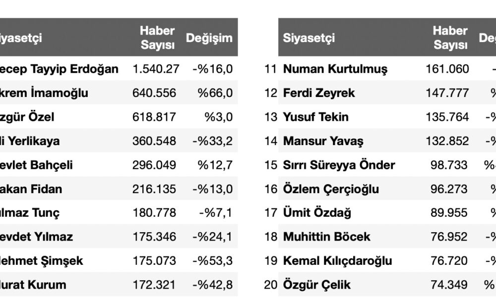 “Cumhurbaşkanı Recep Tayyip Erdoğan, 1.540.279 haberle yine listenin zirvesine yerleşti. Ekrem İmamoğlu, önceki yıla göre yüzde 66 artışla 640.556 habere konu olurken, 2024te yüzde 238lik rekora imza atarak listeye ikinci sıradan giren Özgür Özel, bu kez 618.817 haberler 3. sırada konumlandı. Geçtiğimiz yıl ikinci sırada bulunan Ali Yerlikaya, yüzde 33 düşüşe rağmen 360.548 haberle dördüncülüğü korudu. Devlet Bahçeli ise yüzde 13e varan artışla 296.049 habere konu oldu ve 5. sırada yer aldı.