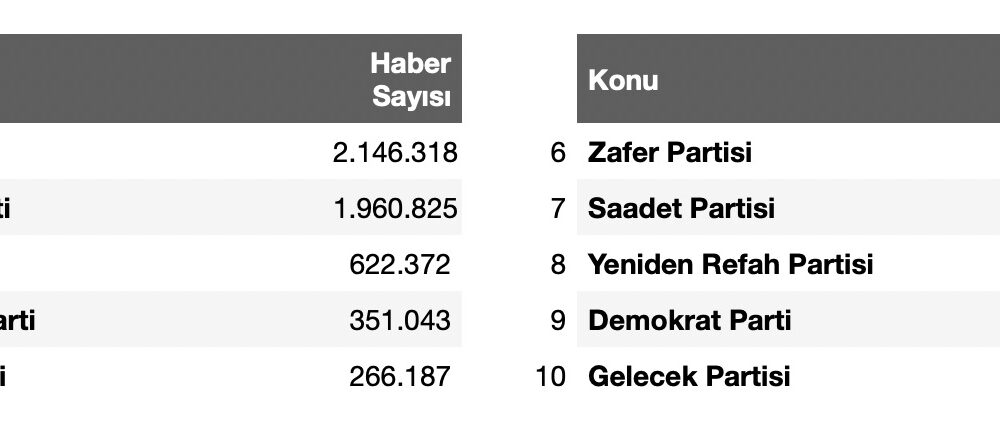 Rapora göre, 2025te basında en çok haber olan siyasi parti 2 milyonu aşkın haberle Cumhuriyet Halk Partisi (CHP), en çok haber olan siyasetçi ise 1,5 milyon haberle Cumhurbaşkanı ve Adalet ve Kalkınma Partisi (AK Parti) Genel Başkanı Recep Tayyip Erdoğan oldu. Onu sırasıyla Ekrem İmamoğlu, CHP Genel Başkanı Özgür Özel, İçişleri Bakanı Ali Yerlikaya ve Milliyetçi Hareket Partisi (MHP) Genel Başkanı Devlet Bahçeli izledi.