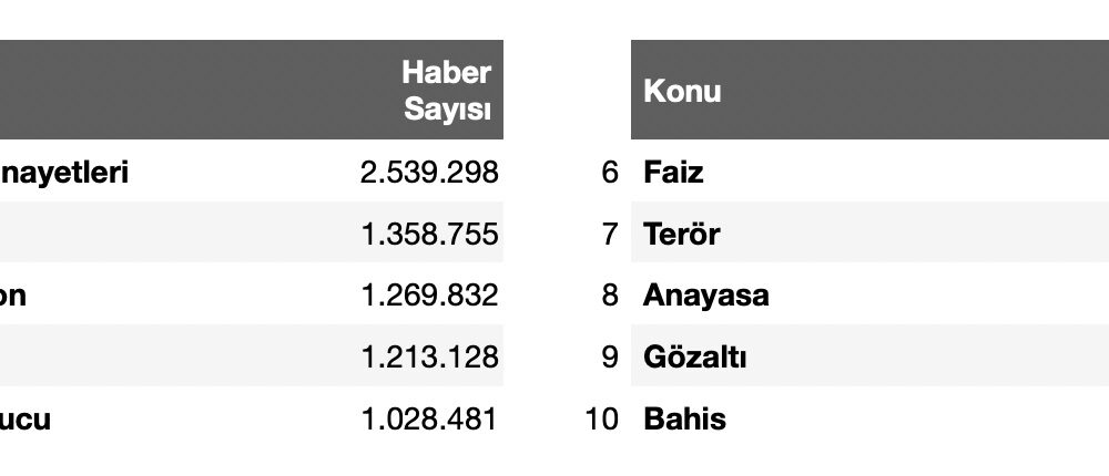 Raporda 2025te yayımlanan 60 milyonu aşkın haberde, bazı kelimelerin izinin de sürüldüğü ifade edildi. Açıklamada, “Kadın cinayetleri 2,5 milyonu aşkın haberle ilk sırada yer aldı. Onu 1,4 milyona yaklaşan haberle adalet izledi. 2025te enflasyon, vergi, uyuşturucu ve faizler hakkında toplam 4,5 milyondan fazla haber yayımlandı. Terör, anayasa, gözaltı ve bahis de haberlerde en çok kullanılan kelimeler arasında yer aldı” denildi.
