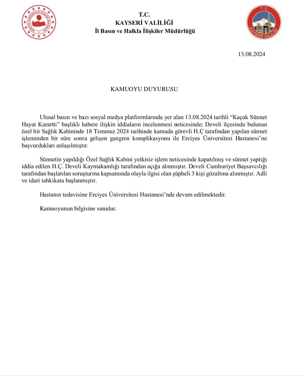 Kayseri Valiliği tarafından olayla ilgili yapılan açıklamada, “Ulusal basın ve bazı sosyal medya platformlarında yer alan 13.08.2024 tarihli Kaçak Sünnet Hayat Kararttı başlıklı habere ilişkin iddiaların incelenmesi neticesinde; Develi ilçesinde bulunan özel bir sağlık kabininde, 18 Temmuz 2024 tarihinde kamuda görevli H.Ç. tarafından yapılan sünnet işleminden bir süre sonra gelişen kangren komplikasyonu ile Erciyes Üniversitesi Hastanesine başvurdukları anlaşılmıştır. Sünnetin yapıldığı özel sağlık kabini, yetkisiz işlem neticesinde kapatılmış ve sünnet yaptığı iddia edilen H.Ç., Develi Kaymakamlığı tarafından açığa alınmıştır. Develi Cumhuriyet Başsavcılığı tarafından başlatılan soruşturma kapsamında olayla ilgisi olan şüpheli 3 kişi gözaltına alınmıştır. Adli ve idari tahkikata başlanmıştır. Hastanın tedavisine Erciyes Üniversitesi Hastanesinde devam edilmektedir” ifadelerine yer verildi.