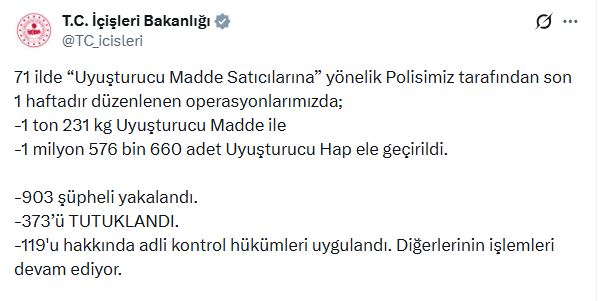 Bakanlığın sanal medya hesabından yapılan açıklamaya göre; İl Emniyet Müdürlüklerince toplam 71 ilde 2 bin 385 ekip, 5 bin 785 personel, 16 hava aracı ve 45 narkotik dedektör köpeğinin katılımıyla operasyonlar düzenlendi. Operasyonlarda 1 ton 231 kilogram uyuşturucu madde ile 1 milyon 576 bin 660 uyuşturucu hap ele geçirildi. 903 şüpheli yakalandı, 373’ü tutuklandı, 119u hakkında adli kontrol hükümleri uygulandı. Diğerlerinin işlemleri devam ediyor.