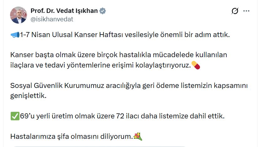 Bakan Işıkhan, sanal medya hesabından yaptığı açıklamada, “1-7 Nisan Ulusal Kanser Haftası vesilesiyle önemli bir adım attık. Kanser başta olmak üzere birçok hastalıkla mücadelede kullanılan ilaçlara ve tedavi yöntemlerine erişimi kolaylaştırıyoruz. Sosyal Güvenlik Kurumumuz aracılığıyla geri ödeme listemizin kapsamını genişlettik. 69u yerli üretim olmak üzere 72 ilacı daha listemize dahil ettik. Hastalarımıza şifa olmasını diliyorum” dedi. İlaçlardan 6sının kanser, 6sının kronik immün trombositopenik purpura (ITP), 6sının diyabet, 5inin kolesterol, 3ünün de multiple skleroz (MS) ilacı olduğu belirtildi.