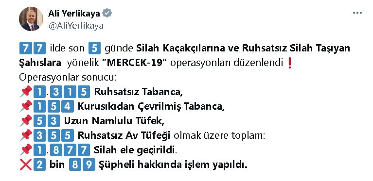 Bakan Yerlikaya, sosyal medya hesabından yaptığı açıklamada, İl Jandarma Komutanlıkları ve İl Emniyet Müdürlükleri tarafından son 5 günde 77 ilde silah kaçakçılığı ve ruhsatsız silah taşıyanlara yönelik Mercek-19 operasyonları düzenlendiğini belirtti. Buna göre; evlerde, iş yerlerinde, halka açık alanlarda ve yol aramalarında 1315 ruhsatsız tabanca, 154 kurusıkıdan çevrilmiş tabanca, 53 uzun namlulu tüfek, 355 ruhsatsız av tüfeği olmak üzere toplam 1877 silah ele geçirildi, 2 bin 89 şüpheli hakkında işlem yapıldı.