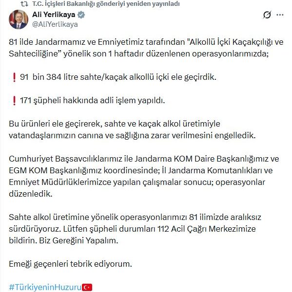 Bakan Yerlikaya, jandarma ve polis tarafından son bir haftadır düzenlenen operasyonları sanal medya hesabından duyurdu. Buna göre; yurt genelinde düzenlenen operasyonlarda 91 bin 384 litre sahte/kaçak içki ele geçirildi, 171 şüpheli hakkında adli işlem yapıldı. Yerlikaya, “Sahte alkol üretimine yönelik operasyonlarımızı 81 ilimizde aralıksız sürdürüyoruz. Lütfen şüpheli durumları 112 Acil Çağrı Merkezimize bildirin. Biz gereğini yapalım. Emeği geçenleri tebrik ediyorum” ifadelerini kullandı.