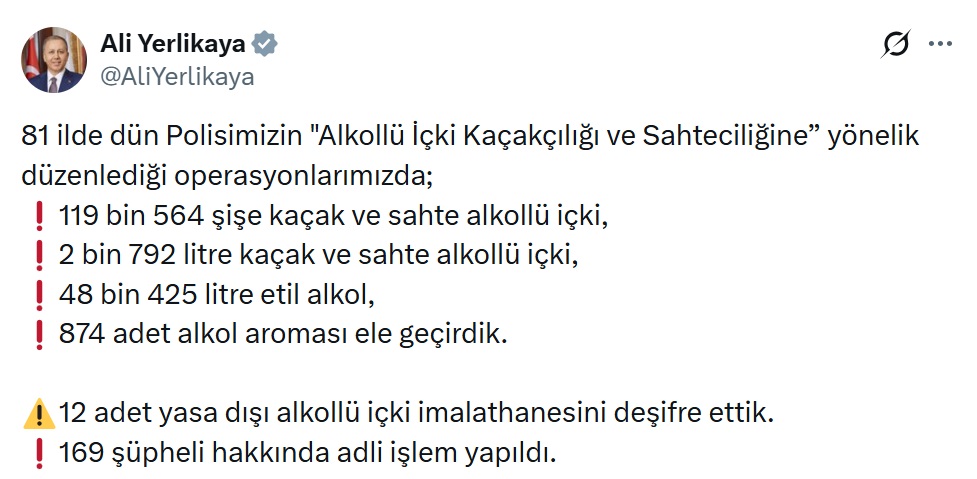 İçişleri Bakanı Ali Yerlikaya, 81 ilde polis tarafından düzenlenen operasyonları sosyal medya hesabından paylaştı. Buna göre; Alkollü içki kaçakçılığı ve sahteciliğine yönelik düzenlediği operasyonlarda 119 bin 564 şişe kaçak ve sahte alkollü içki, 2 bin 792 litre kaçak ve sahte alkollü içki, 48 bin 425 litre etil alkol, 874 adet alkol aroması ele geçirildi. 12 yasa dışı alkollü içki imalathanesi deşifre edildi. 169 şüpheli hakkında adli işlem yapıldı.