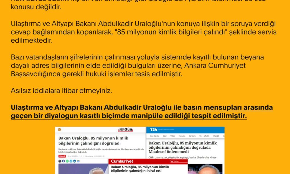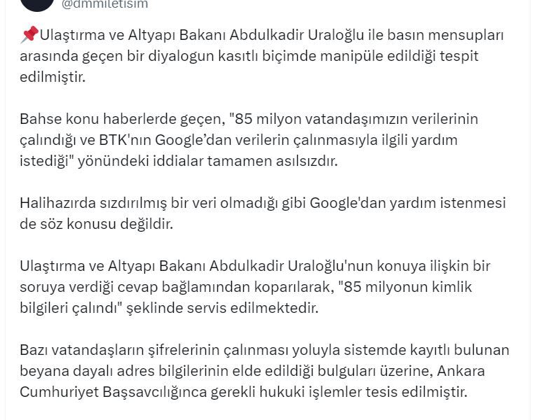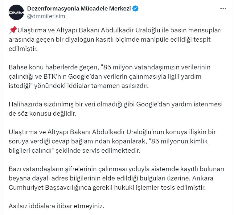 Dezenformasyonla Mücadele Merkezinin sosyal medya hesabından yapılan açıklamada, “Ulaştırma ve Altyapı Bakanı Abdulkadir Uraloğlu ile basın mensupları arasında geçen bir diyalogun kasıtlı biçimde manipüle edildiği tespit edilmiştir. Bahse konu haberlerde geçen, 85 milyon vatandaşımızın verilerinin çalındığı ve BTKnın Googledan verilerin çalınmasıyla ilgili yardım istediği yönündeki iddialar tamamen asılsızdır. Halihazırda sızdırılmış bir veri olmadığı gibi Googledan yardım istenmesi de söz konusu değildir. Ulaştırma ve Altyapı Bakanı Abdulkadir Uraloğlunun konuya ilişkin bir soruya verdiği cevap bağlamından koparılarak, 85 milyonun kimlik bilgileri çalındı şeklinde servis edilmektedir. Bazı vatandaşların şifrelerinin çalınması yoluyla sistemde kayıtlı bulunan beyana dayalı adres bilgilerinin elde edildiği bulguları üzerine, Ankara Cumhuriyet Başsavcılığınca gerekli hukuki işlemler tesis edilmiştir. Asılsız iddialara itibar etmeyiniz” denildi.