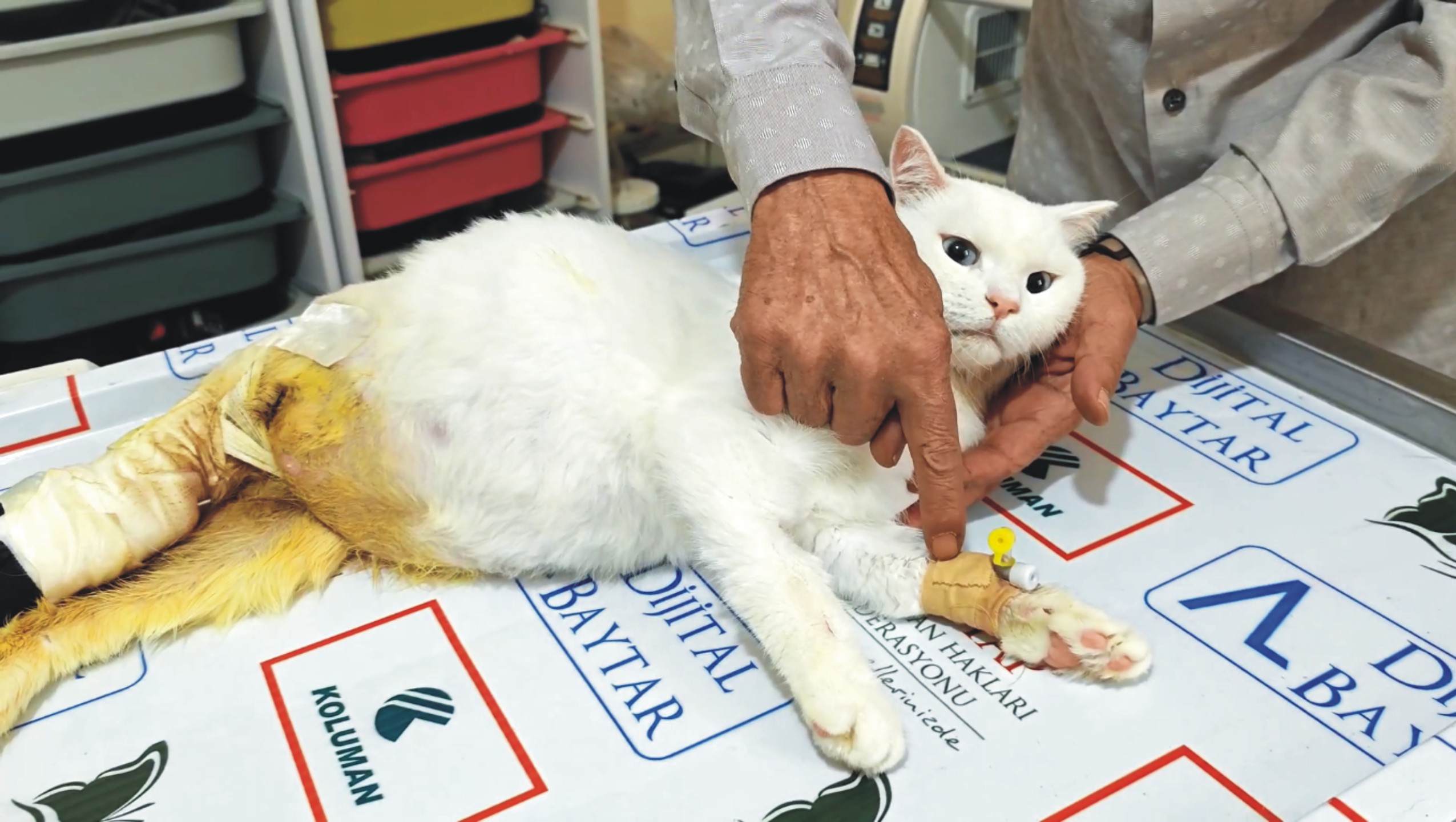 Veteriner Hekim Ali Laçinbala ise “Halil amcamız akşam saatlerinde bizleri aradı ve kedinin fotoğrafları ile bilgilerini bizlerle paylaştı. 400 kilometre uzaklıkta bulunan kediyi sırf şifa olabiliriz maksadıyla bize getirdi. Yapmış olduğumuz ilk muayenede karın bölgesinde çok ciddi bir şişkinlik fark ettik. Mesaneye sonda bağladık ve boşalttık. Lavman yaparak bağırsakları boşaltmaya çalıştık ancak karındaki şişlik bir türlü inmeyince karın boşluğunda küçük bir operasyonla içeriği tespit etmeye çalıştık. Karın içi, kedinin 4 gündür beslendiği fakat boşaltamadığı sıvı ile kaplıydı. Yoğun bakımda müşahede altına aldığımız kedimizin kırık bölgesinde de çok ciddi bir açık yara ve enfeksiyon tespit edildi. Elimizden gelen bütün destek ile bu cana şifa olmaya çalışıyoruz” diye konuştu.