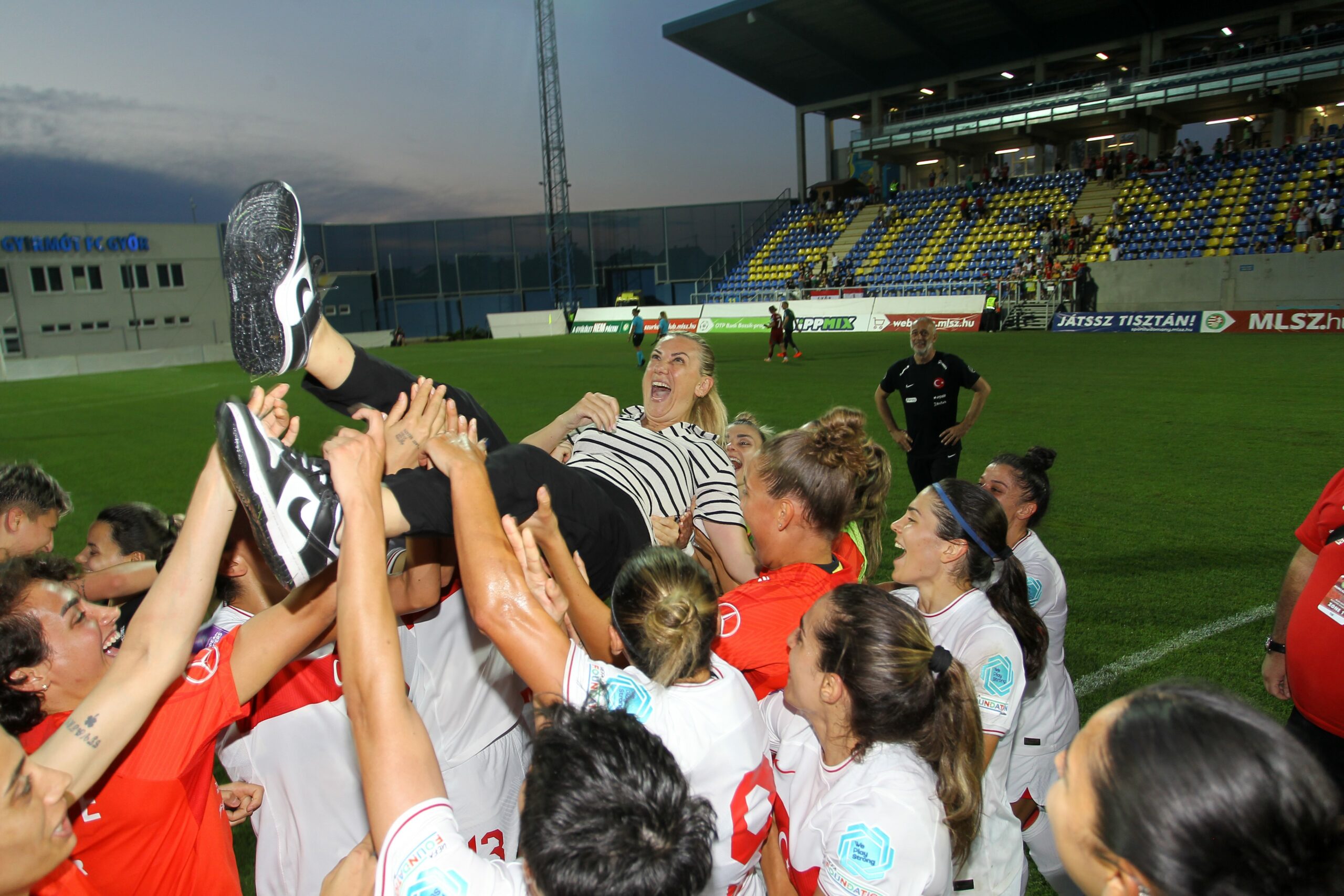 Öte yandan mücadeleyi Türkiye Futbol Federasyonu (TFF) Kadın Futbolu Direktörü Eren Şenyaprak ile Budapeşte Büyükelçisi Gülşen Karanis Ekşioğlu birlikte izledi. Ekşioğlu, maç öncesi teknik ekip ve takıma çiçek verdi, başarı diledi.