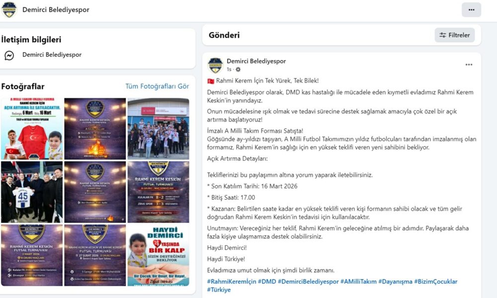 Kampanya, kulübün resmi sosyal medya hesapları üzerinden yapılan duyuruyla başlatıldı. Açık artırma süreci, ilgili paylaşımın altına yapılacak yorumlarla yürütülecek. Belirlenen süre sonunda en yüksek fiyat teklifini veren kişi hem milli formanın sahibi olacak hem de küçük Rahmi Kerem Keskin sağlığına kavuşması için umut olacak. Demirci Belediyespor Yöneticisi Mustafa Kula, formadan elde edilecek gelirin tamamının, Rahmi Kerem Keskin adına açılan valilik onaylı resmi bağış hesabına yatırılacağını duyurdu.