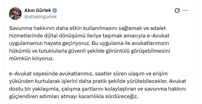 Bakan Gürlek, sanal medya hesabından yaptığı açıklamada, “Savunma hakkının daha etkin kullanılmasını sağlamak ve adalet hizmetlerinde dijital dönüşümü ileriye taşımak amacıyla e-Avukat uygulamamızı hayata geçiriyoruz. Bu uygulama ile avukatlarımızın hükümlü ve tutuklularla güvenli şekilde görüntülü görüşebilmesini mümkün kılıyoruz. e-Avukat sayesinde avukatlarımız, saatler süren ulaşım ve erişim yükünden kurtularak işlerini daha pratik şekilde yürütebilecekler. Avukat dostu bir yaklaşımla, çalışma şartlarını kolaylaştıran ve savunma hakkını güçlendiren adımları atmayı kararlılıkla sürdüreceğiz” ifadelerini kullandı.