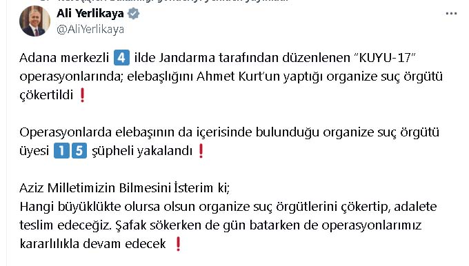Bakan Yerlikaya, sosyal medya hesabından yaptığı açıklamada, Yumurtalık Cumhuriyet Başsavcılığı ve Jandarma Genel Komutanlığı Kaçakçılık ve Organize Suçlarla Mücadele Daire Başkanlığı koordinesinde Adana merkezli İstanbul, Malatya ve Şanlıurfada Kuyu-17 operasyonları düzenlendiğini belirtti. Buna göre; Nitelikli yağma, Mala zarar verme, Kasten yaralama, Silahla tehdit ve 6136 sayılı Kanuna muhalefet suçlarını örgütlü olarak işledikleri, kurdukları sözde mahkemelerde mağdurlara ceza vererek taşınır/taşınmaz mallarına el koydukları, tehdit, cebir, şiddet ve şantaj ile el koydukları malları başkasının üzerine zorla geçirdikleri ve bundan komisyon aldıkları belirlenen 15 şüpheli yakalandı. Yakalananlar arasında örgüt elebaşı Ahmet Kurt da yer aldı. Operasyonlar sonucu çok sayıda av tüfeği, alacak verecek defteri, satış anlaşmaları ve mağdurların haklarından feragat ettiğine dair zorla doldurtulmuş dilekçeler ele geçirildi.