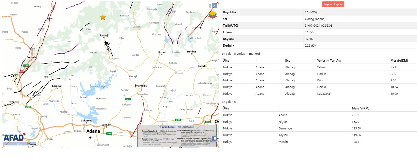 Afet ve Acil Durum Yönetimi Başkanlığının (AFAD) merkez üssünü Aladağ ilçesi olarak saptadığı deprem, saat 05.55te meydana geldi. Yerin 9.26 kilometre derinliğinde olan deprem, çevre ilçelerde de hissedildi. Depremde ilk belirlemelere göre herhangi bir olumsuzluk yaşanmadı.