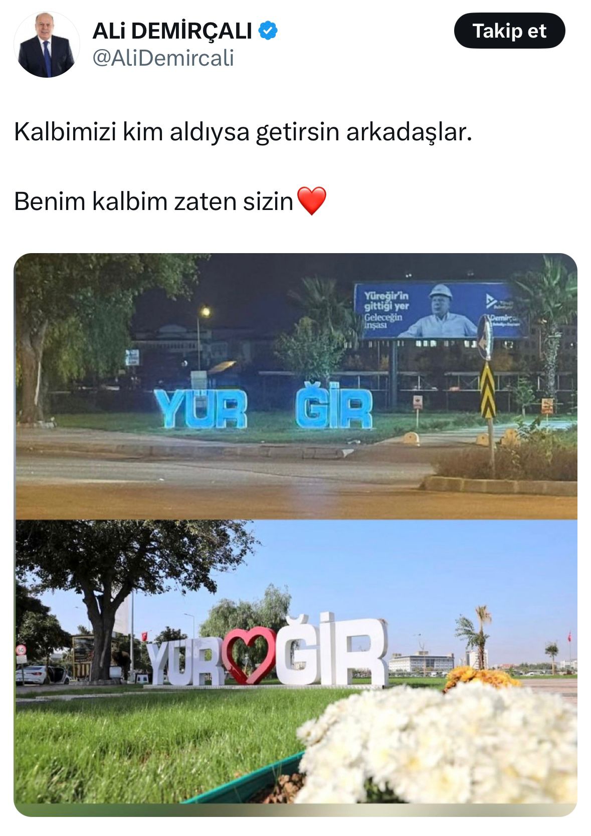• Yüreğir Belediye Başkanı Ali Demirçalı, sosyal medya hesabından paylaşım yaparak kalp sembolünü çalanlara seslendi. Fotoğraf: Adana, (DHA)