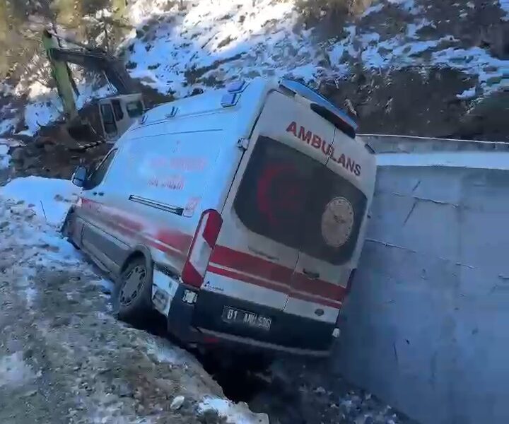 Adana’da buzlanma nedeniyle kayan ambulans şarampole düştü