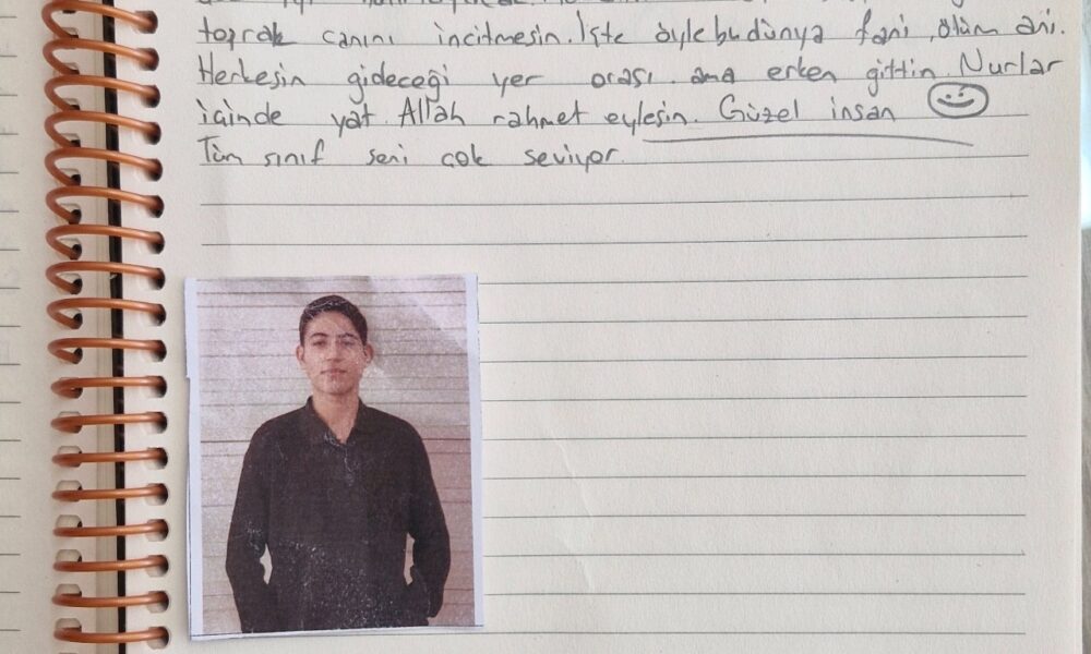 • Adana'nın Kozan ilçesinde bayram ziyaretinden dönerken minibüsle çarpışan otomobilde yaşamını yitiren Bedirhan Güleç için hazırlanan anı defterine arkadaşları ve öğretmenlerinin yazdığı notlar duygulandırdı. Fotoğraf: Ali GÖKDAL/Kozan,(Adana),(DHA)