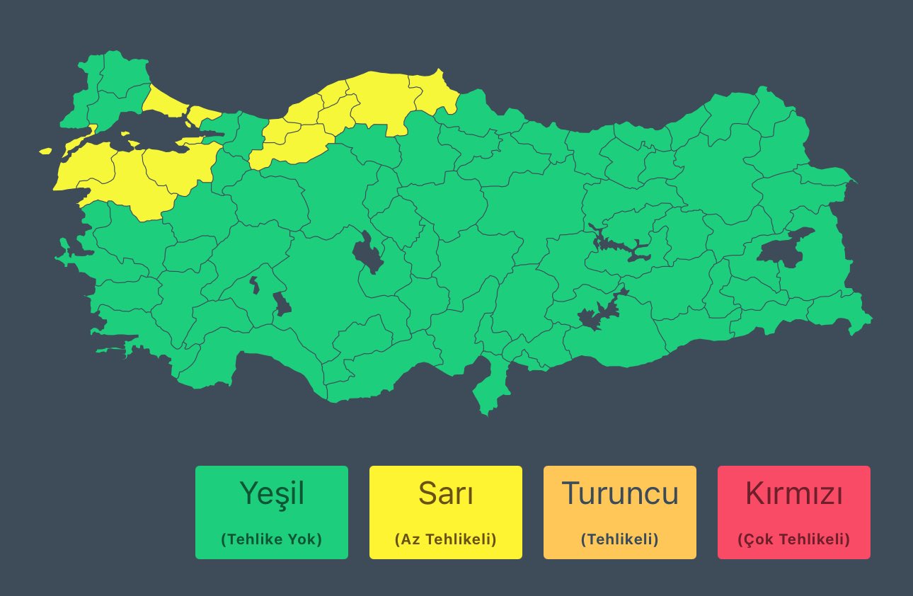 AFAD, sosyal medya hesabından yaptığı paylaşımda, Meteoroloji Genel Müdürlüğü’nden alınan son bilgi ve yapılan değerlendirmelere göre; 12 Ekim Cumartesi günü, İstanbul, Düzce, Zonguldak, Bolu, Bartın, Karabük, Kastamonu ve Sinop çevrelerinde, Çanakkalenin; Lapseki, Biga, Balıkesirin; Gönen, Erdek, Marmara, Manyas, Bandırma, Bursanın; Merkez, Karacabey, Mudanya, Gemlik ilçeleri ile Yalova çevrelerinde, yerel kuvvetli sağanak ve gök gürültülü sağanak yağış beklendiğini bildirdi. AFAD açıklamasında, “Vatandaşlarımızın ani sel, su baskını, yıldırım, yerel küçük çaplı dolu yağışı, ani kuvvetli rüzgar ve kısa süreli fırtına ile ulaşımda aksamalar gibi olumsuzluklara karşı dikkatli olmasını önemle hatırlatıyoruz “ifadelerini kullandı.