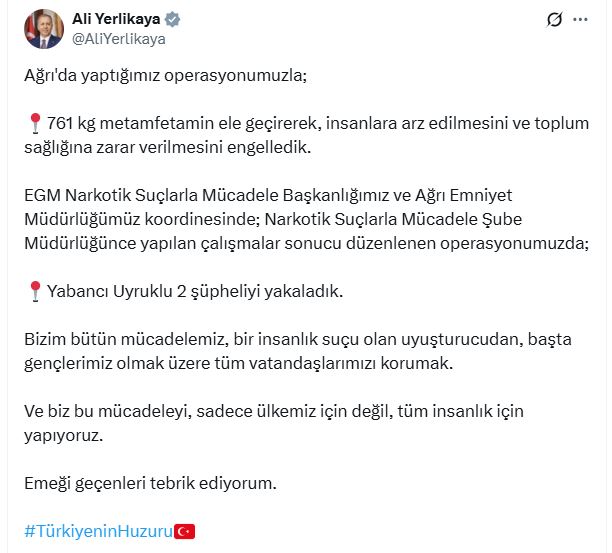 İçişleri Bakanı Ali Yerlikaya, Ağrıda polis tarafından düzenlenen narkotik operasyonunu sosyal medya hesabından açıkladı. Buna göre; Narkotik Suçlarla Mücadele Başkanlığı ve Ağrı Emniyet Müdürlüğü koordinesinde düzenlenen operasyonda yabancı uyruklu 2 şüpheli gözaltına alındı, 761 kilogram metamfetamin ele geçirildi.