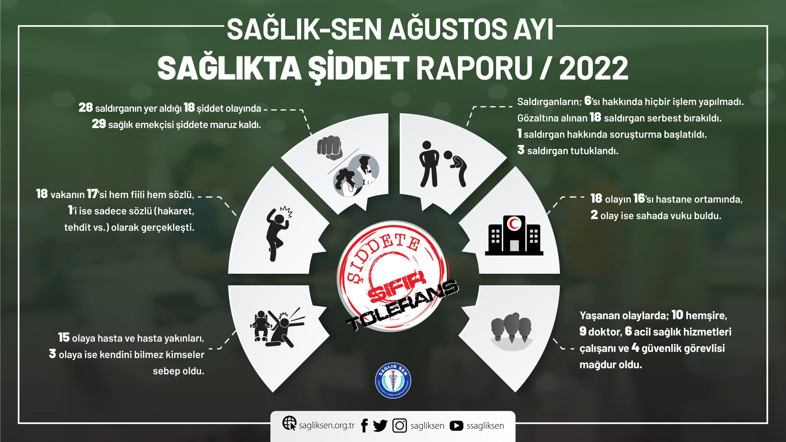SAĞLIK-Sen’in ‘Sağlıkta Şiddet Raporu’nda ağustos ayında sağlık çalışanlarına yönelik 18 şiddet olayının meydana geldiği, 29 sağlık çalışanın mağdur olduğu belirtildi.