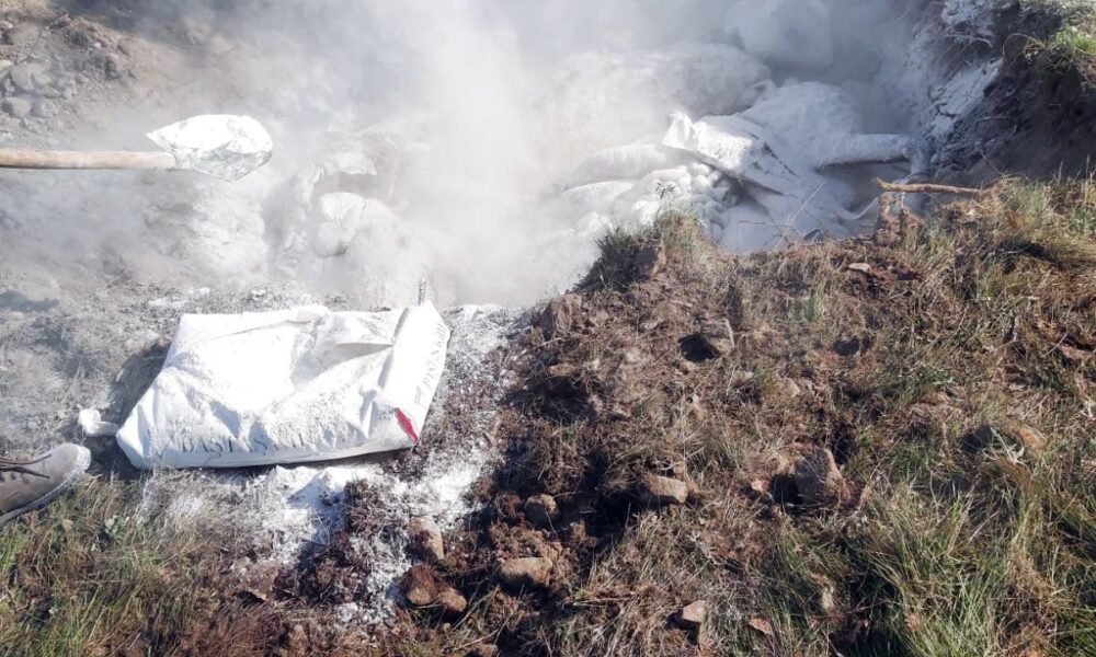 Özkan çiftinin ihbarı üzerine köye gelen İlçe Tarım Müdürlüğü ekiplerinin nezaretinde ölen hayvanlar iş makinesiyle açılan çukura gömüldü.