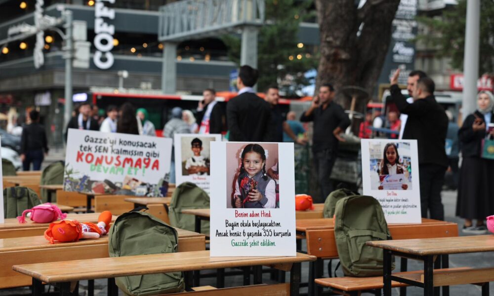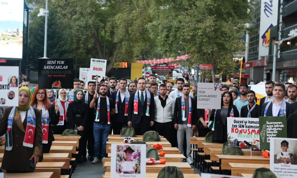 AK Parti Gençlik Kolları, Türkiyede yeni eğitim-öğretim yılının başlaması nedeniyle Gazzede eğitim hakkından mahrum bırakılan ve hayatlarını kaybeden çocukları 81 ilde andı. Ankarada da AK Parti Gençlik Kolları Genel Başkanı Yusuf İbiş ve gençlik kolları üyeleri, Kızılay Meydanında boş sıralara Gazzede ölen çocukların fotoğraflarını koydu. Gençlik Kolları Genel Başkanı İbiş, bugün yeni eğitim-öğretim yılının başladığını anımsatarak, “Milyonlarca çocuğumuz, gencimiz sevinçle okullarına dönüyor, sıralarını dolduruyor. Ancak Gazze’de manzara bambaşka. Orada binlerce sıra bomboş, çünkü o sıralara oturacak çocuklar artık hayatta değil. Gazze’de binlerce masum çocuk, sıralarına kavuşamadan öldürüldü ya da yarım kalmış hayallerinin başında susturuldu. Katil İsrail, 7 Ekim’den bu yana 19 bin çocuğu katletti. O çocukların çantaları kapının arkasında asılı kaldı. Defterleri hiç açılmadı. Kalemleri hiç yazmadı. Hayatları, katil İsrail’in bombalarıyla ellerinden alındı. Katil İsrail çocukların geleceğe açılan kapıları da hedef alındı” dedi.