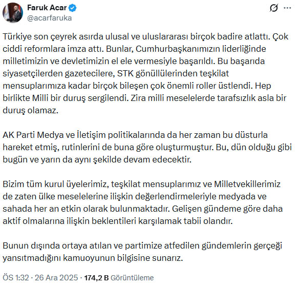 AK Partili Acar, sanal medya hesabından yaptığı açıklamada, “Türkiye son çeyrek asırda ulusal ve uluslararası birçok badire atlattı. Çok ciddi reformlara imza attı. Bunlar, Cumhurbaşkanımızın liderliğinde milletimizin ve devletimizin el ele vermesiyle başarıldı. Bu başarıda siyasetçilerden gazetecilere, STK gönüllülerinden teşkilat mensuplarımıza kadar birçok bileşen çok önemli roller üstlendi. Hep birlikte milli bir duruş sergilendi. Zira milli meselelerde tarafsızlık asla bir duruş olamaz. AK Parti medya ve iletişim politikalarında da her zaman bu düsturla hareket etmiş, rutinlerini de buna göre oluşturmuştur. Bu, dün olduğu gibi bugün ve yarın da aynı şekilde devam edecektir. Bizim tüm kurul üyelerimiz, teşkilat mensuplarımız ve milletvekillerimiz de zaten ülke meselelerine ilişkin değerlendirmeleriyle medyada ve sahada her an etkin olarak bulunmaktadır. Gelişen gündeme göre daha aktif olmalarına ilişkin beklentileri karşılamak tabii olandır. Bunun dışında ortaya atılan ve partimize atfedilen gündemlerin gerçeği yansıtmadığını kamuoyunun bilgisine sunarız” ifadelerini kullandı.