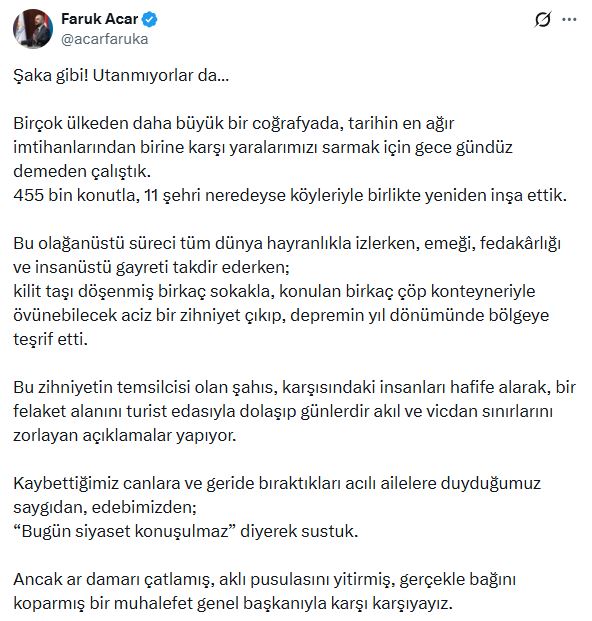 AK Partili Acar, sanal medya hesabından yaptığı açıklamada, “Şaka gibi, utanmıyorlar da. Birçok ülkeden daha büyük bir coğrafyada, tarihin en ağır imtihanlarından birine karşı yaralarımızı sarmak için gece gündüz demeden çalıştık. 455 bin konutla, 11 şehri neredeyse köyleriyle birlikte yeniden inşa ettik. Bu olağanüstü süreci tüm dünya hayranlıkla izlerken, emeği, fedakarlığı ve insanüstü gayreti takdir ederken; kilit taşı döşenmiş birkaç sokakla, konulan birkaç çöp konteyneriyle övünebilecek aciz bir zihniyet çıkıp, depremin yıl dönümünde bölgeye teşrif etti. Bu zihniyetin temsilcisi olan şahıs, karşısındaki insanları hafife alarak, bir felaket alanını turist edasıyla dolaşıp günlerdir akıl ve vicdan sınırlarını zorlayan açıklamalar yapıyor. Kaybettiğimiz canlara ve geride bıraktıkları acılı ailelere duyduğumuz saygıdan, edebimizden, Bugün siyaset konuşulmaz diyerek sustuk. Ancak ar damarı çatlamış, aklı pusulasını yitirmiş, gerçekle bağını koparmış bir muhalefet genel başkanıyla karşı karşıyayız. Felaketin ve yıkımın büyüklüğünü sahada gerçek anlamda görmedikleri için şehirlerimizin nasıl ihya edildiğini, hangi emeklerle ayağa kaldırıldığını da idrak edemediklerinin farkındayız. Bu tabloyu görmezden gelerek yalanla, çarpıtmayla ve açık bir acziyetle savrulan bu siyasetin hükmünü aziz milletimizin vicdanına havale ediyoruz. İnsan utanır. Onca emeğe, onca yapılan işe rağmen hakkı teslim etmek yerine siyasi cambazlığa devam edenler bilmelidir ki bu millet, samimiyetsizliğe de istismara da asla prim vermez. Acıyı propaganda malzemesine çeviren bu anlayış, ne milletin hafızasında ne de bu ülkenin siyasi ciddiyetinde bir yer bulur. Bu tavır, çaresizliğin en gürültülü halidir ve milletin nazarında hiçbir karşılık bulamayacaktır” ifadelerini kullandı.