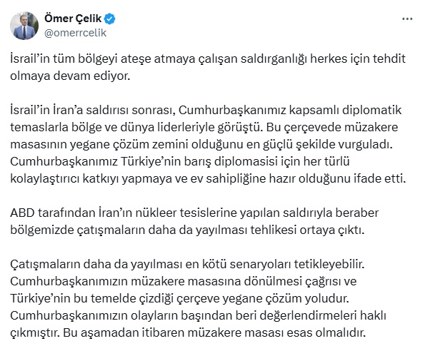 AK Partili Çelik, sosyal medya hesabından yaptığı açıklamada, “İsrail’in tüm bölgeyi ateşe atmaya çalışan saldırganlığı herkes için tehdit olmaya devam ediyor. İsrail’in İran’a saldırısı sonrası, Cumhurbaşkanımız kapsamlı diplomatik temaslarla bölge ve dünya liderleriyle görüştü. Bu çerçevede müzakere masasının yegane çözüm zemini olduğunu en güçlü şekilde vurguladı. Cumhurbaşkanımız Türkiye’nin barış diplomasisi için her türlü kolaylaştırıcı katkıyı yapmaya ve ev sahipliğine hazır olduğunu ifade etti. ABD tarafından İran’ın nükleer tesislerine yapılan saldırıyla beraber bölgemizde çatışmaların daha da yayılması tehlikesi ortaya çıktı. Çatışmaların daha da yayılması en kötü senaryoları tetikleyebilir. Cumhurbaşkanımızın müzakere masasına dönülmesi çağrısı ve Türkiye’nin bu temelde çizdiği çerçeve yegane çözüm yoludur. Cumhurbaşkanımızın olayların başından beri değerlendirmeleri haklı çıkmıştır. Bu aşamadan itibaren müzakere masası esas olmalıdır” dedi.