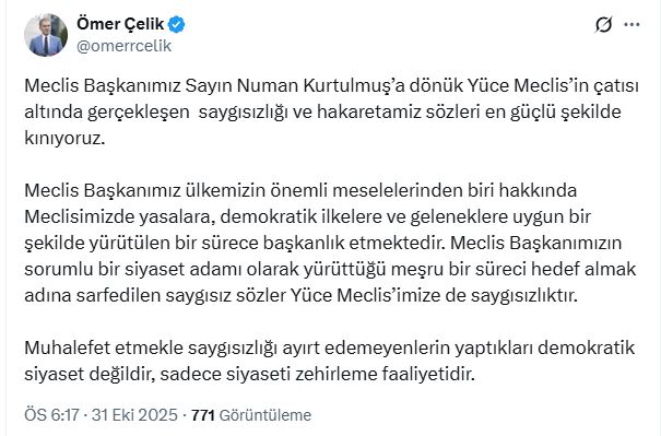 AK Partili Çelik, TBMM Plan ve Bütçe Komisyonunda Terörsüz Türkiye süreci ile ilgili çıkan tartışmaya ilişkin sosyal medya hesabından açıklama yaptı. Çelik, “Meclis Başkanımız Sayın Numan Kurtulmuş’a dönük Yüce Meclisin çatısı altında gerçekleşen saygısızlığı ve hakaretamiz sözleri en güçlü şekilde kınıyoruz. Meclis Başkanımız ülkemizin önemli meselelerinden biri hakkında Meclisimizde yasalara, demokratik ilkelere ve geleneklere uygun bir şekilde yürütülen bir sürece başkanlık etmektedir. Meclis Başkanımızın sorumlu bir siyaset adamı olarak yürüttüğü meşru bir süreci hedef almak adına sarf edilen saygısız sözler yüce Meclisimize de saygısızlıktır. Muhalefet etmekle saygısızlığı ayırt edemeyenlerin yaptıkları demokratik siyaset değildir, sadece siyaseti zehirleme faaliyetidir” ifadelerini kullandı.