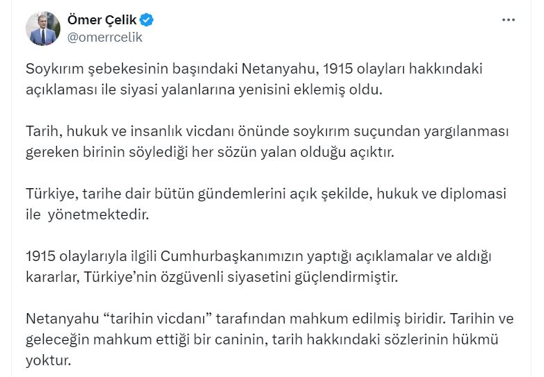 AK Parti Sözcüsü Çelik, sosyal medya hesabından yaptığı açıklamada, “Soykırım şebekesinin başındaki Netanyahu, 1915 olayları hakkındaki açıklaması ile siyasi yalanlarına yenisini eklemiş oldu. Tarih, hukuk ve insanlık vicdanı önünde soykırım suçundan yargılanması gereken birinin söylediği her sözün yalan olduğu açıktır. Türkiye, tarihe dair bütün gündemlerini açık şekilde, hukuk ve diplomasi ile yönetmektedir. 1915 olaylarıyla ilgili Cumhurbaşkanımızın yaptığı açıklamalar ve aldığı kararlar, Türkiyenin özgüvenli siyasetini güçlendirmiştir. Netanyahu tarihin vicdanı tarafından mahkum edilmiş biridir. Tarihin ve geleceğin mahkum ettiği bir caninin, tarih hakkındaki sözlerinin hükmü yoktur” ifadelerine yer verdi.