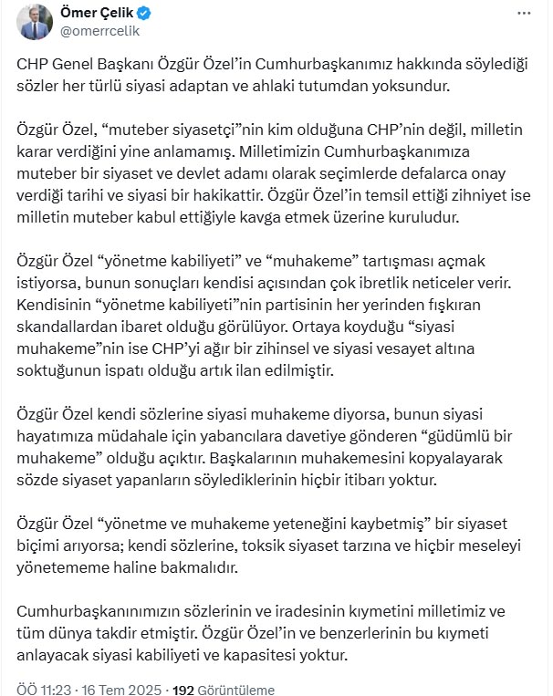 AK Partili Ömer Çelik, sosyal medya hesabından yaptığı açıklamada, “CHP Genel Başkanı Özgür Özel’in Cumhurbaşkanımız hakkında söylediği sözler her türlü siyasi adaptan ve ahlaki tutumdan yoksundur. Özgür Özel, muteber siyasetçinin kim olduğuna CHP’nin değil, milletin karar verdiğini yine anlamamış. Milletimizin Cumhurbaşkanımıza muteber bir siyaset ve devlet adamı olarak seçimlerde defalarca onay verdiği tarihi ve siyasi bir hakikattir. Özgür Özel’in temsil ettiği zihniyet ise milletin muteber kabul ettiğiyle kavga etmek üzerine kuruludur. Özgür Özel yönetme kabiliyeti ve muhakeme tartışması açmak istiyorsa, bunun sonuçları kendisi açısından çok ibretlik neticeler verir. Kendisinin yönetme kabiliyetinin partisinin her yerinden fışkıran skandallardan ibaret olduğu görülüyor. Ortaya koyduğu siyasi muhakemenin ise CHPyi ağır bir zihinsel ve siyasi vesayet altına soktuğunun ispatı olduğu artık ilan edilmiştir. Özgür Özel, kendi sözlerine siyasi muhakeme diyorsa, bunun siyasi hayatımıza müdahale için yabancılara davetiye gönderen güdümlü bir muhakeme olduğu açıktır. Başkalarının muhakemesini kopyalayarak sözde siyaset yapanların söylediklerinin hiçbir itibarı yoktur. Özgür Özel, yönetme ve muhakeme yeteneğini kaybetmiş bir siyaset biçimi arıyorsa; kendi sözlerine, toksik siyaset tarzına ve hiçbir meseleyi yönetememe haline bakmalıdır. Cumhurbaşkanımızın sözlerinin ve iradesinin kıymetini milletimiz ve tüm dünya takdir etmiştir. Özgür Özel’in ve benzerlerinin bu kıymeti anlayacak siyasi kabiliyeti ve kapasitesi yoktur” ifadelerini kullandı.