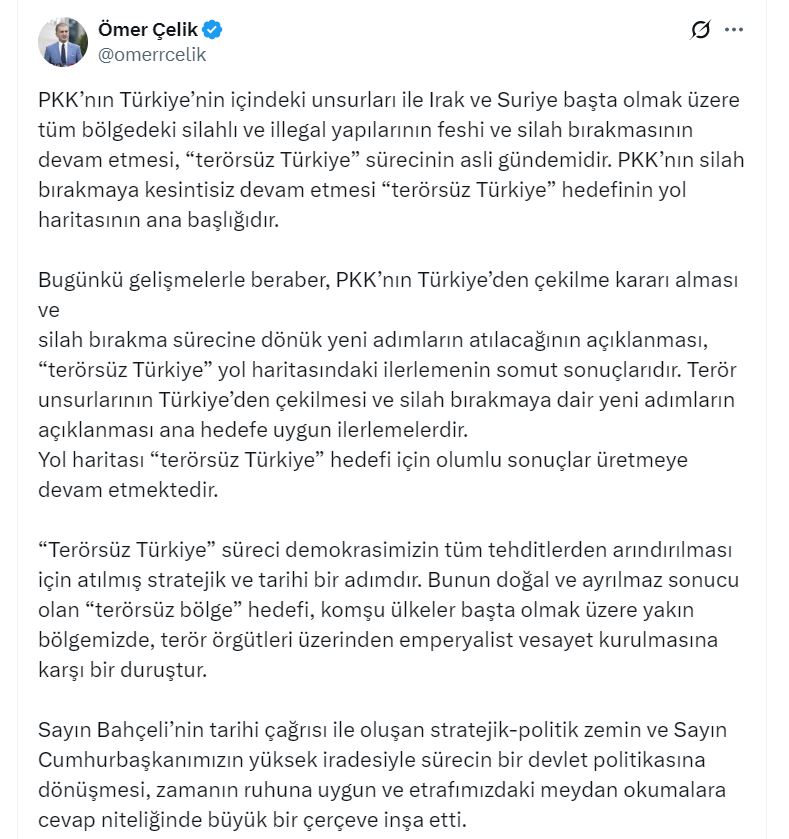 AK Parti Sözcüsü Çelik, sosyal medya hesabından yaptığı açıklamada, “PKKnın Türkiye’nin içindeki unsurları ile Irak ve Suriye başta olmak üzere tüm bölgedeki silahlı ve illegal yapılarının feshi ve silah bırakmasının devam etmesi, Terörsüz Türkiye sürecinin asli gündemidir. PKKnın silah bırakmaya kesintisiz devam etmesi Terörsüz Türkiye hedefinin yol haritasının ana başlığıdır. Bugünkü gelişmelerle beraber, PKKnın Türkiyeden çekilme kararı alması ve silah bırakma sürecine dönük yeni adımların atılacağının açıklanması, Terörsüz Türkiye yol haritasındaki ilerlemenin somut sonuçlarıdır. Terör unsurlarının Türkiyeden çekilmesi ve silah bırakmaya dair yeni adımların açıklanması ana hedefe uygun ilerlemelerdir. Yol haritası Terörsüz Türkiye hedefi için olumlu sonuçlar üretmeye devam etmektedir” dedi.
