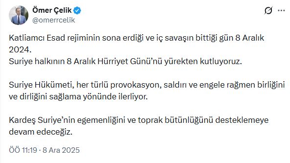 AK Partili Ömer Çelik, sosyal medya hesabından yaptığı açıklamada, “Katliamcı Esad rejiminin sona erdiği ve iç savaşın bittiği gün 8 Aralık 2024. Suriye halkının 8 Aralık Hürriyet Gününü yürekten kutluyoruz. Suriye hükümeti, her türlü provokasyon, saldırı ve engele rağmen birliğini ve dirliğini sağlama yönünde ilerliyor. Kardeş Suriyenin egemenliğini ve toprak bütünlüğünü desteklemeye devam edeceğiz” ifadelerini kullandı.