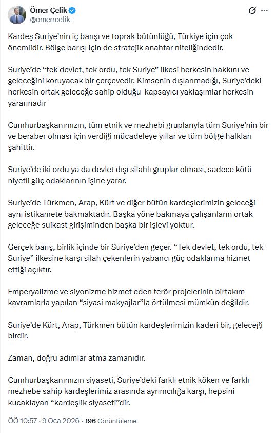 AK Partili Çelik, Suriyede yaşanan gelişmelere ilişkin sanal medya hesabından açıklama yaptı. Çelik, “Kardeş Suriyenin iç barışı ve toprak bütünlüğü, Türkiye için çok önemlidir. Bölge barışı için de stratejik anahtar niteliğindedir. Suriyede Tek devlet, tek ordu, tek Suriye ilkesi herkesin hakkını ve geleceğini koruyacak bir çerçevedir. Kimsenin dışlanmadığı, Suriyedeki herkesin ortak geleceğe sahip olduğu kapsayıcı yaklaşımlar herkesin yararınadır. Cumhurbaşkanımızın, tüm etnik ve mezhebi gruplarıyla tüm Suriyenin bir ve beraber olması için verdiği mücadeleye yıllar ve tüm bölge halkları şahittir. Suriyede iki ordu ya da devlet dışı silahlı gruplar olması, sadece kötü niyetli güç odaklarının işine yarar. Suriyede Türkmen, Arap, Kürt ve diğer bütün kardeşlerimizin geleceği aynı istikamete bakmaktadır. Başka yöne bakmaya çalışanların ortak geleceğe suikast girişiminden başka bir işlevi yoktur. Gerçek barış, birlik içinde bir Suriyeden geçer. Tek devlet, tek ordu, tek Suriye ilkesine karşı silah çekenlerin yabancı güç odaklarına hizmet ettiği açıktır. Emperyalizme ve Siyonizme hizmet eden terör projelerinin birtakım kavramlarla yapılan siyasi makyajlarla örtülmesi mümkün değildir. Suriyede Kürt, Arap, Türkmen bütün kardeşlerimizin kaderi bir, geleceği birdir. Zaman, doğru adımlar atma zamanıdır. Cumhurbaşkanımızın siyaseti, Suriyedeki farklı etnik köken ve farklı mezhebe sahip kardeşlerimiz arasında ayrımcılığa karşı, hepsini kucaklayan kardeşlik siyasetidir” dedi.
