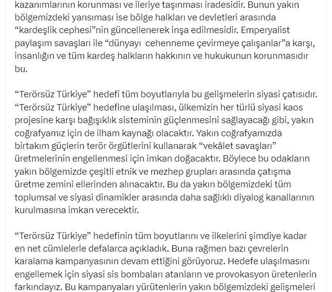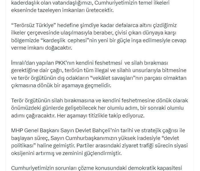“İmralıdan yapılan PKKnın kendini feshetmesi ve silah bırakması gerektiğine dair çağrı, terörün tüm illegal ve silahlı unsurlarıyla bitmesine ve terör örgütünün dış odakların vekalet savaşlarının parçası olmaktan çıkmasına dönük bir aşamaya geçmelidir. Terör örgütünün silah bırakmasına ve kendini feshetmesine dönük olarak önümüzdeki günlerde gelişebilecek her olumlu adım, bir sonraki olumlu adımı çağıracaktır. Her aşamayı titizlikle takip ediyoruz. MHP Genel Başkanı Sayın Devlet Bahçeli’nin tarihi ve stratejik çağrısı ile başlayan süreç, Sayın Cumhurbaşkanımızın yüksek iradesiyle devlet politikası haline gelmiştir. Partiler arasındaki ziyaret trafiği sürecin siyasi oksijenini artırmış ve zeminini güçlendirmiştir. Cumhuriyetimizin sorunları çözme konusundaki demokratik kapasitesi yüksektir. Türkiye Cumhuriyeti, tek vatan, tek millet, tek devlet, tek bayrak ilkesi esasında, millet şuuru ve devlet aklı ile gündemine hakimdir.”