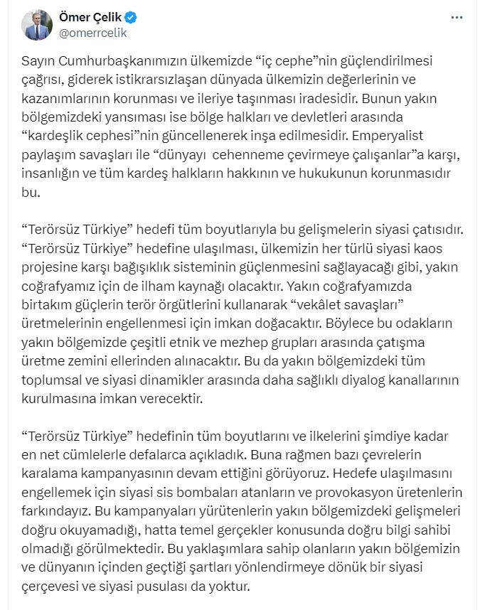 AK Parti Sözcüsü Çelik, sosyal medya hesabından yaptığı açıklamada, “Sayın Cumhurbaşkanımızın ülkemizde iç cephenin güçlendirilmesi çağrısı, giderek istikrarsızlaşan dünyada ülkemizin değerlerinin ve kazanımlarının korunması ve ileriye taşınması iradesidir. Bunun yakın bölgemizdeki yansıması ise bölge halkları ve devletleri arasında kardeşlik cephesinin güncellenerek inşa edilmesidir. Emperyalist paylaşım savaşları ile dünyayı cehenneme çevirmeye çalışanlara karşı, insanlığın ve tüm kardeş halkların hakkının ve hukukunun korunmasıdır bu. Terörsüz Türkiye hedefi tüm boyutlarıyla bu gelişmelerin siyasi çatısıdır. Terörsüz Türkiye hedefine ulaşılması, ülkemizin her türlü siyasi kaos projesine karşı bağışıklık sisteminin güçlenmesini sağlayacağı gibi, yakın coğrafyamız için de ilham kaynağı olacaktır. Yakın coğrafyamızda birtakım güçlerin terör örgütlerini kullanarak vekalet savaşları üretmelerinin engellenmesi için imkan doğacaktır. Böylece bu odakların yakın bölgemizde çeşitli etnik ve mezhep grupları arasında çatışma üretme zemini ellerinden alınacaktır. Bu da yakın bölgemizdeki tüm toplumsal ve siyasi dinamikler arasında daha sağlıklı diyalog kanallarının kurulmasına imkan verecektir” değerlendirmesinde bulundu.