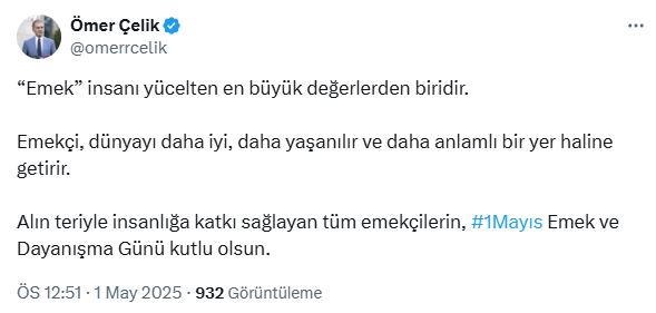 AK Partili Çelik, sosyal medya hesabından paylaştığı mesajda, “Emek insanı yücelten en büyük değerlerden biridir. Emekçi, dünyayı daha iyi, daha yaşanılır ve daha anlamlı bir yer haline getirir. Alın teriyle insanlığa katkı sağlayan tüm emekçilerin, 1 Mayıs Emek ve Dayanışma Günü kutlu olsun” ifadelerini kullandı.