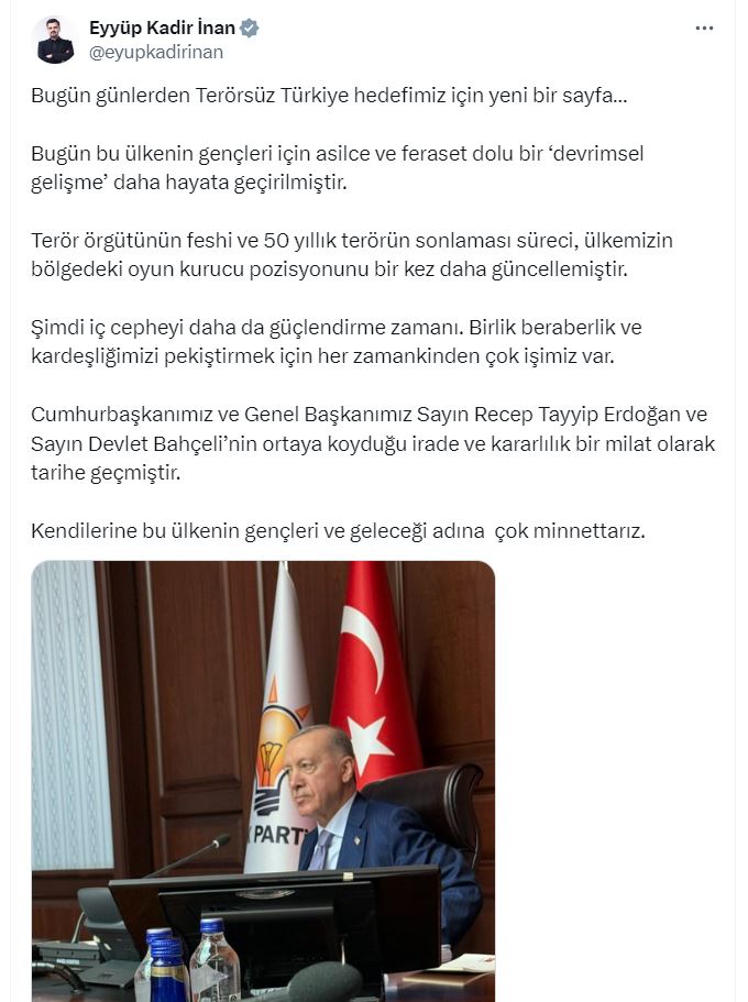 AK Partili İnan, terör örgütü PKKnın silah bırakma ve fesih kararıyla ilgili sosyal medya hesabından açıklama yaptı. İnan, “Bugün günlerden Terörsüz Türkiye hedefimiz için yeni bir sayfa. Bugün bu ülkenin gençleri için asilce ve feraset dolu bir devrimsel gelişme daha hayata geçirilmiştir. Terör örgütünün feshi ve 50 yıllık terörün sonlaması süreci, ülkemizin bölgedeki oyun kurucu pozisyonunu bir kez daha güncellemiştir. Şimdi iç cepheyi daha da güçlendirme zamanı. Birlik beraberlik ve kardeşliğimizi pekiştirmek için her zamankinden çok işimiz var. Cumhurbaşkanımız ve Genel Başkanımız Sayın Recep Tayyip Erdoğan ve Sayın Devlet Bahçeli’nin ortaya koyduğu irade ve kararlılık bir milat olarak tarihe geçmiştir. Kendilerine bu ülkenin gençleri ve geleceği adına çok minnettarız” dedi.