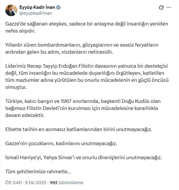 AK Partili İnan, Gazzede ateşkesin sağlanmasına ilişkin sosyal medya hesabından açıklama yaptı. İnan, “Gazze’de sağlanan ateşkes, sadece bir anlaşma değil insanlığın yeniden nefes alışıdır. Yıllardır süren bombardımanların, gözyaşlarının ve sessiz feryatların ardından gelen bu adım, vicdanların neticesidir. Liderimiz Recep Tayyip Erdoğan Filistin davasının yalnızca bir destekçisi değil, tüm insanlığın bu mücadelede duyarlılığını örgütleyen, katledilen tüm mazlumlar adına yürütülen bu onurlu mücadelenin en güçlü öncüsü olmuştur. Türkiye, kalıcı barışın ve 1967 sınırlarında, başkenti Doğu Kudüs olan bağımsız Filistin devletinin kurulması için mücadelesine kararlılıkla devam edecektir. Elbette tarihin en acımasız katliamlarından birini unutmayacağız. Gazzenin çocuklarını, kadınlarını unutmayacağız. İsmail Haniyeyi, Yahya Sinvarı ve onurlu direnişlerini unutmayacağız. Tüm şehitlerimize rahmetle” ifadelerini kullandı.