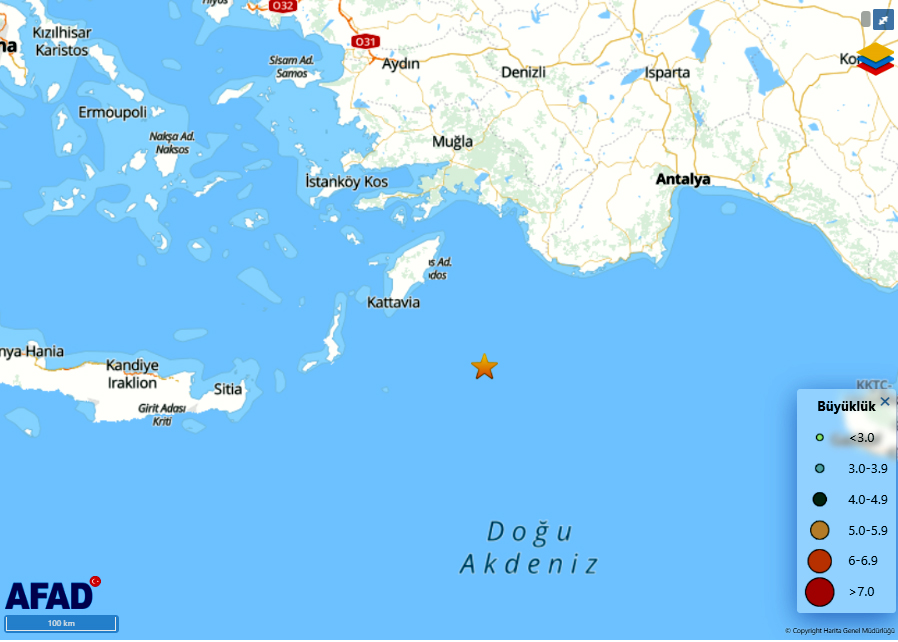Afet ve Acil Durum Yönetimi Başkanlığı (AFAD) Deprem Dairesi’nin verilerine göre Akdeniz’de 4,7 büyüklüğünde deprem meydana geldi. Saat 19.54’te Antalya Kaş ilçesinin 113,96 kilometre açığında 23,55 kilometre derinlikte kaydedilen deprem ilk belirlemelere göre herhangi bir zarara neden olmadı.