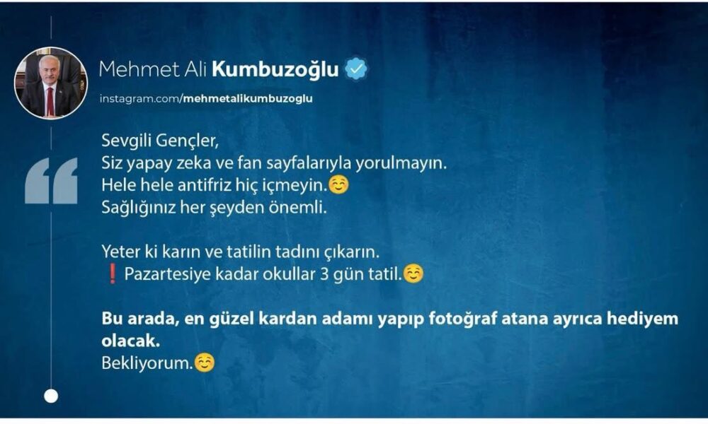 Aksaray Valisi Mehmet Ali Kumbuzoğlu, sanal medya hesabından yaptığı açıklamada, kent genelinde yoğun kar yağışı ve buzlanma nedeniyle okulların tatil edildiğini duyurdu Vali Kumbuzoğlu, “Sevgili gençler siz yapay zeka ve fan sayfalarıyla yorulmayın. Hele hele antifriz hiç içmeyin. Sağlığınız her şeyden önemli. Yeter ki yarın karın tadını çıkarın. Pazartesi gününü kadar okullar 3 gün tatil. Bu arada en güzel kardan adamı yapıp fotoğraf atana ayrıca hediyem olacak,” dedi.