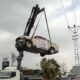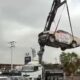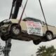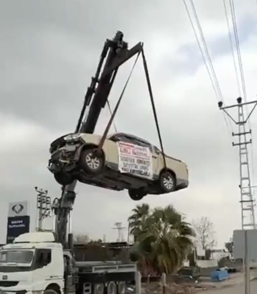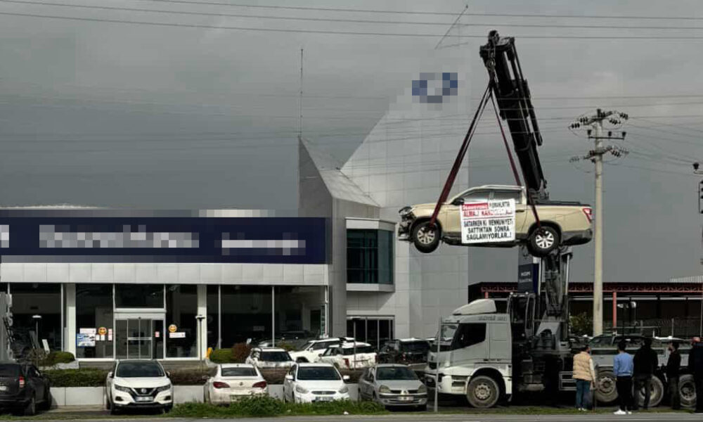 Aldığı sıfır kamyoneti, hatalı çıktığını öne sürüp, bayinin önünde vinçle kaldırarak sergiledi