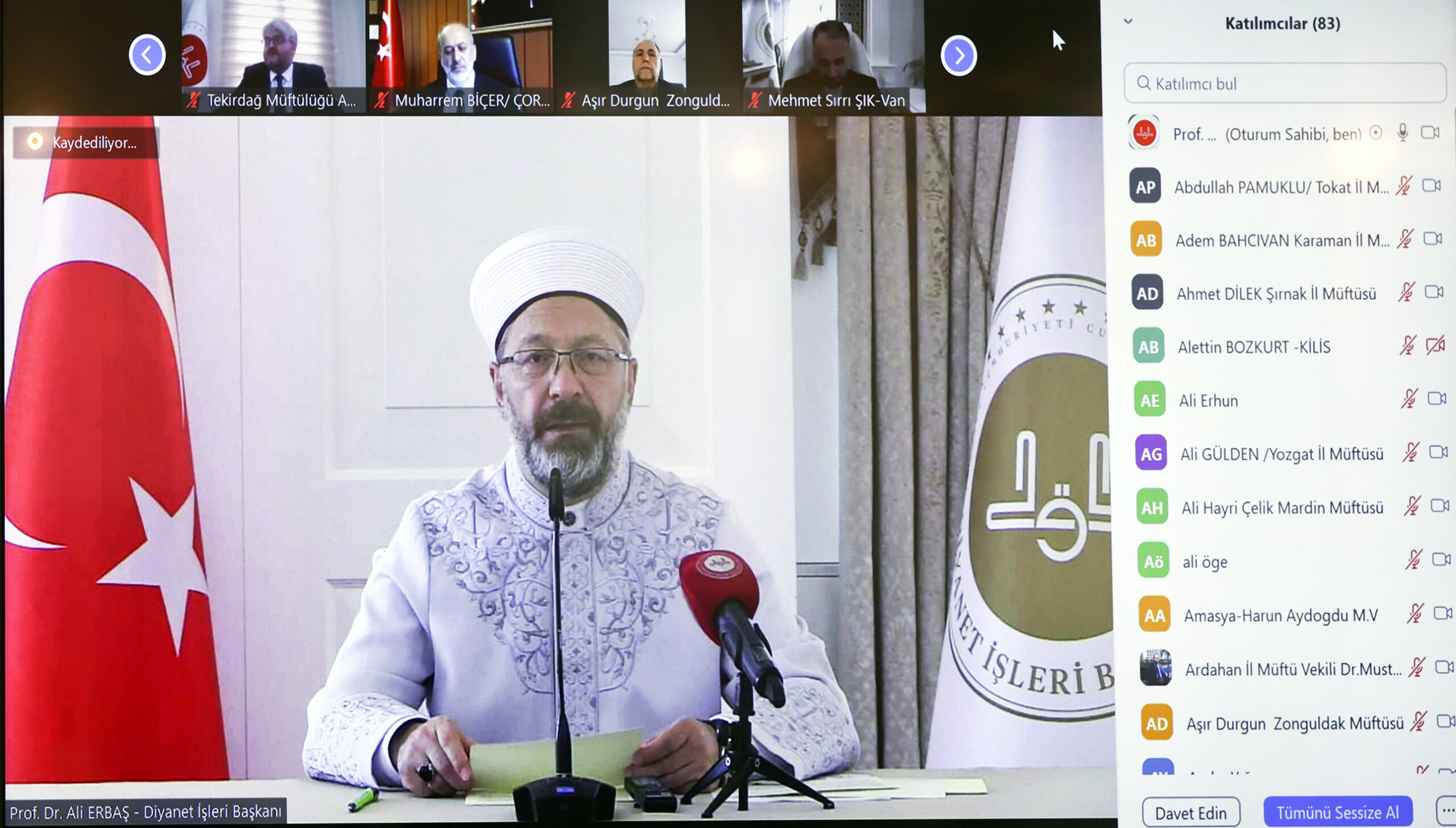 Ali Erbaş, il müftüleriyle çevrim içi toplantıda bir araya geldi. Erbaş, geride kalan eğitim- döneminin muhasebesinin yapılacağını ve yaklaşan yaz Kuran kurslarının verimliliğinin artırılması konularını ele alacaklarını söyledi. Diyanet İşleri Başkanlığı’nın ürettiği sahih dini bilgi ve icra ettiği nitelikli, kuşatıcı hizmetleriyle insanların manevi hayatına rehberlik ettiğine dikkat çeken Erbaş, “İslam’ın; iman, ibadet, bilgi ve güzel ahlak merkezli değerlerini bireysel ve toplumsal hayata taşıma noktasında Kuran kurslarımızın özel bir yeri vardır. İnsanımızı sahih dini bilgiyle buluşturmak amacıyla ülkemizin her köşesinde hizmet veren Kuran kurslarımız, milletimizin ve nesillerimizin inanca, ibadete ve hayata dair doğru ve güvenilir bilgiye ulaşmaları noktasında çok büyük bir imkandır” diye konuştu.
