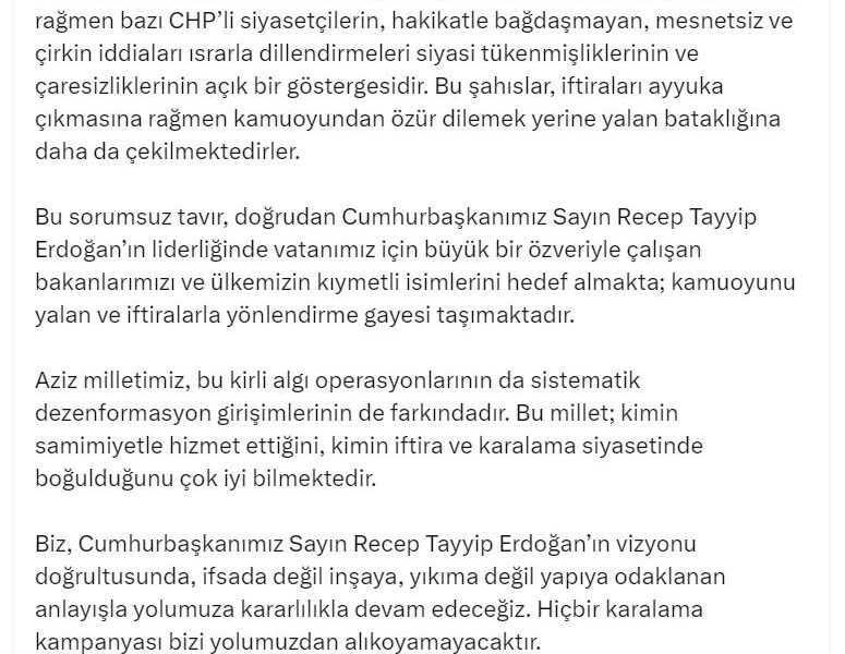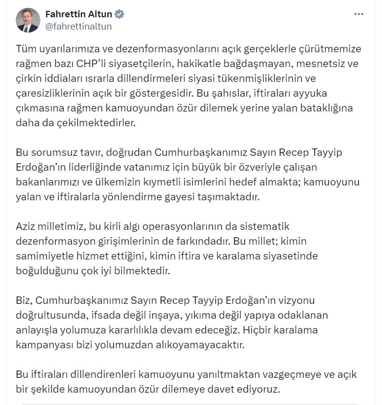 Aziz Türk milletinin, bu kirli algı operasyonlarının ve sistematik dezenformasyon girişimlerinin farkında olduğunu işaret eden Altun, “Bu millet; kimin samimiyetle hizmet ettiğini, kimin iftira ve karalama siyasetinde boğulduğunu çok iyi bilmektedir. Biz, Cumhurbaşkanımız Sayın Recep Tayyip Erdoğan’ın vizyonu doğrultusunda, ifsada değil inşaya, yıkıma değil yapıya odaklanan anlayışla yolumuza kararlılıkla devam edeceğiz. Hiçbir karalama kampanyası bizi yolumuzdan alıkoyamayacaktır. Bu iftiraları dillendirenleri kamuoyunu yanıltmaktan vazgeçmeye ve açık bir şekilde kamuoyundan özür dilemeye davet ediyoruz” ifadelerini kullandı.