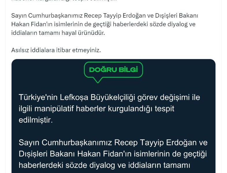 İletişim Başkanlığı Dezenformasyonla Mücadele Merkezi, dün sosyal medya hesabından yaptığı açıklamada, “Türkiyenin Lefkoşa Büyükelçiliği görev değişimi ile ilgili manipülatif haberler kurgulandığı tespit edilmiştir. Sayın Cumhurbaşkanımız Recep Tayyip Erdoğan ve Dışişleri Bakanı Hakan Fidanın isimlerinin de geçtiği haberlerdeki sözde diyalog ve iddiaların tamamı hayal ürünüdür. Asılsız iddialara itibar etmeyiniz” ifadelerine yer verdi.
