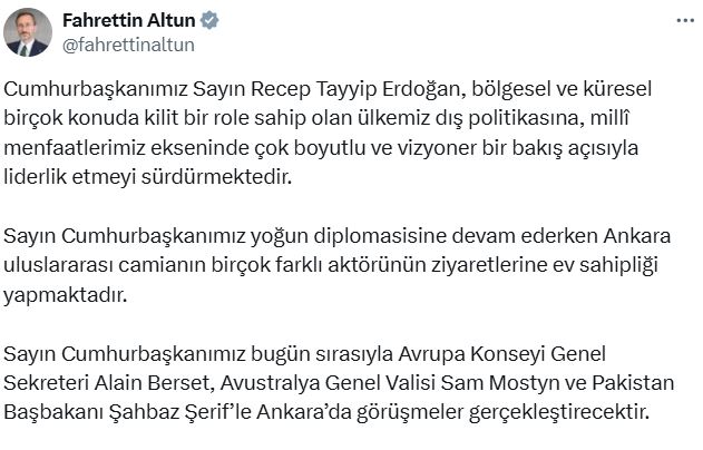 İletişim Başkanı Altun, sosyal medya hesabından yaptığı paylaşımda, “Cumhurbaşkanımız Sayın Recep Tayyip Erdoğan, bölgesel ve küresel birçok konuda kilit bir role sahip olan ülkemiz dış politikasına, milli menfaatlerimiz ekseninde çok boyutlu ve vizyoner bir bakış açısıyla liderlik etmeyi sürdürmektedir. Sayın Cumhurbaşkanımız yoğun diplomasisine devam ederken Ankara uluslararası camianın birçok farklı aktörünün ziyaretlerine ev sahipliği yapmaktadır. Sayın Cumhurbaşkanımız, bugün sırasıyla Avrupa Konseyi Genel Sekreteri Alain Berset, Avustralya Genel Valisi Sam Mostyn ve Pakistan Başbakanı Şahbaz Şerif’le Ankara’da görüşmeler gerçekleştirecektir” dedi.
