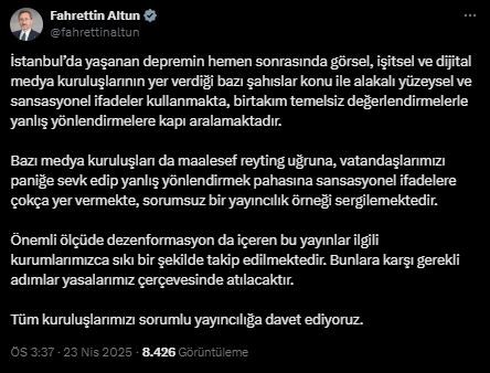 İletişim Başkanı Altun, Marmara Denizinde, Silivri açıklarında meydana gelen 6.2 büyüklüğündeki depremlere ilişkin sosyal medya hesabından açıklama yaptı. Altun, “İstanbulda yaşanan depremin hemen sonrasında görsel, işitsel ve dijital medya kuruluşlarının yer verdiği bazı şahıslar konu ile alakalı yüzeysel ve sansasyonel ifadeler kullanmakta, birtakım temelsiz değerlendirmelerle yanlış yönlendirmelere kapı aralamaktadır. Bazı medya kuruluşları da maalesef reyting uğruna, vatandaşlarımızı paniğe sevk edip yanlış yönlendirmek pahasına sansasyonel ifadelere çokça yer vermekte, sorumsuz bir yayıncılık örneği sergilemektedir. Önemli ölçüde dezenformasyon da içeren bu yayınlar ilgili kurumlarımızca sıkı bir şekilde takip edilmektedir. Bunlara karşı gerekli adımlar yasalarımız çerçevesinde atılacaktır. Tüm kuruluşlarımızı sorumlu yayıncılığa davet ediyoruz” açıklamalarında bulundu.