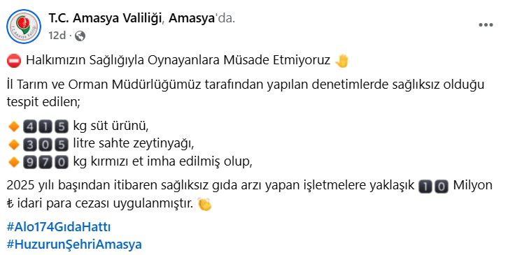Amasya Valiliğinden yapılan yazılı açıklamada, “Halkımızın sağlığıyla oynayanlara müsaade etmiyoruz. İl Tarım ve Orman Müdürlüğümüz tarafından yapılan denetimlerde sağlıksız olduğu tespit edilen; 415 kilogram süt ürünü, 305 litre sahte zeytinyağı ve 970 kilogram kırmızı et imha edilmiştir. 2025 yılı başından itibaren sağlıksız gıda arzı yapan işletmelere yaklaşık 10 milyon TL idari para cezası uygulanmıştır” denildi.