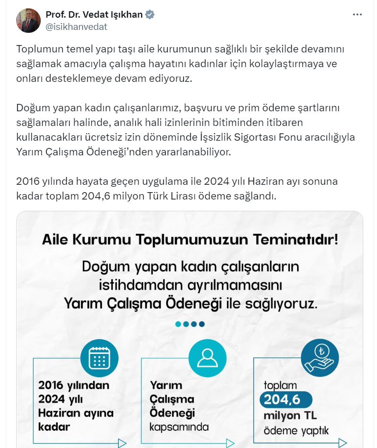 Bakan Işıkhan, sosyal medya hesabından yaptığı açıklamada, “Toplumun temel yapı taşı aile kurumunun sağlıklı bir şekilde devamını sağlamak amacıyla çalışma hayatını kadınlar için kolaylaştırmaya ve onları desteklemeye devam ediyoruz. Doğum yapan kadın çalışanlarımız, başvuru ve prim ödeme şartlarını sağlamaları halinde, analık hali izinlerinin bitiminden itibaren kullanacakları ücretsiz izin döneminde İşsizlik Sigortası Fonu aracılığıyla Yarım Çalışma Ödeneğinden yararlanabiliyor. 2016 yılında hayata geçen uygulama ile 2024 yılı haziran ayı sonuna kadar toplam 204,6 milyon Türk lirası ödeme sağlandı” dedi.