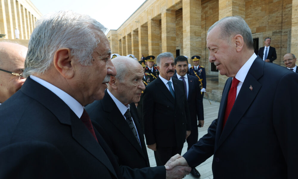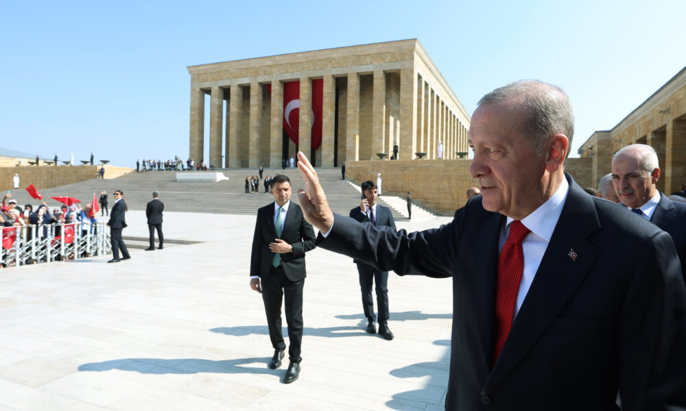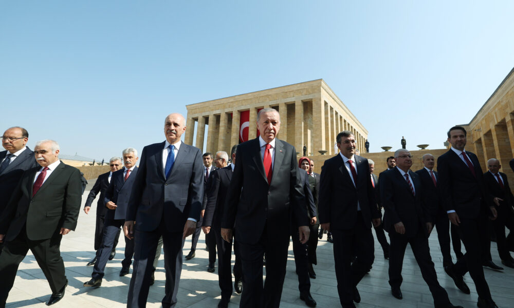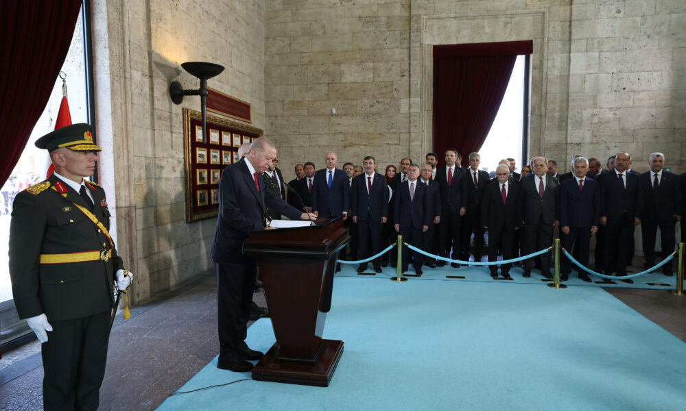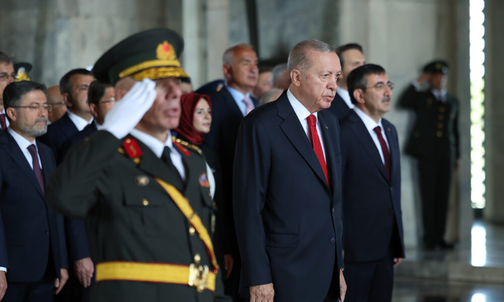 Anıtkabirde düzenlenen törene; Cumhurbaşkanı Recep Tayyip Erdoğan, TBMM Başkanı Numan Kurtulmuş, Cumhurbaşkanı Yardımcısı Cevdet Yılmaz, MHP Genel Başkanı Devlet Bahçeli, İYİ Parti Genel Başkanı Müsavat Dervişoğlu, bakanlar ve kuvvet komutanları katıldı. Cumhurbaşkanı Erdoğan ve beraberindekiler, Aslanlı Yoldan yürüyerek, Atatürkün mozolesine geldi. Erdoğanın, mozoleye çelenk bırakmasının ardından heyet, saygı duruşunda bulunarak İstiklal Marşını okudu. Cumhurbaşkanı Erdoğan ve beraberindekiler, ardından Misak-ı Milli Kulesine geçti. Anıtkabir Özel Defterini imzalayan Erdoğan, şunları yazdı: